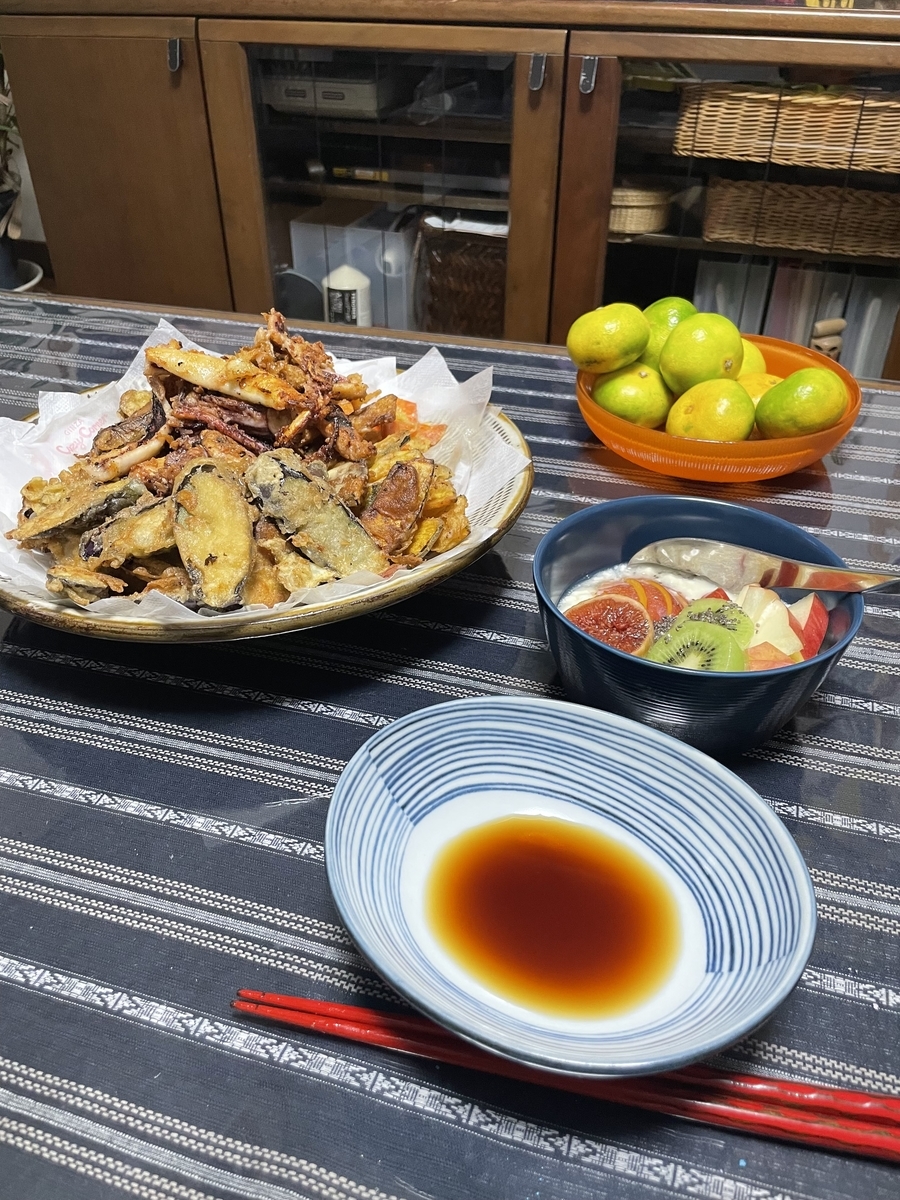 今日2回目の息子の心の中のパンチが炸裂したあたりでご飯の準備を…本当にパンチが出るといけませんので。息子に手伝いを頼み(手伝ってくれました!)天ぷらをあげました。美味しくできました。食べ過ぎました。As always .